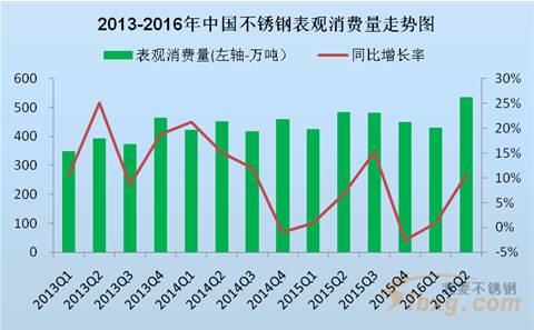 根據51bxg產業(yè)研究中心統(tǒng)計:2016年1-6月,中國不銹鋼表觀消費量為962.8萬噸,同比增加56.2萬噸,增幅為6.2%。